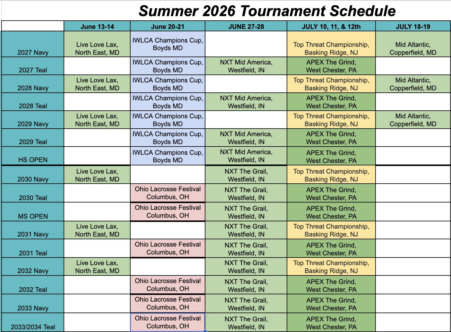 2033 Navy and 2032, 2033/34 Teal Team Summer 2026 Tournaments are: